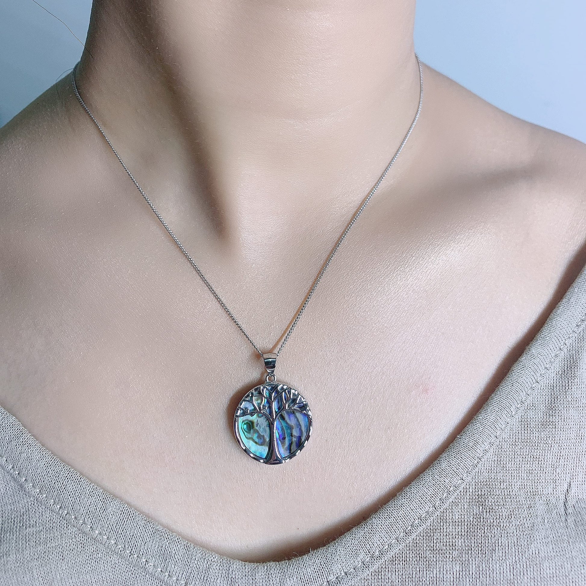 Natural Abalone Shell makes for a beautiful and unique piece of jewelry. The natural properties and composition define the beauty of each piece. Greens blues blacks browns and turquoises come together to create a stunning piece set within this beautiful circle tree pendant.
